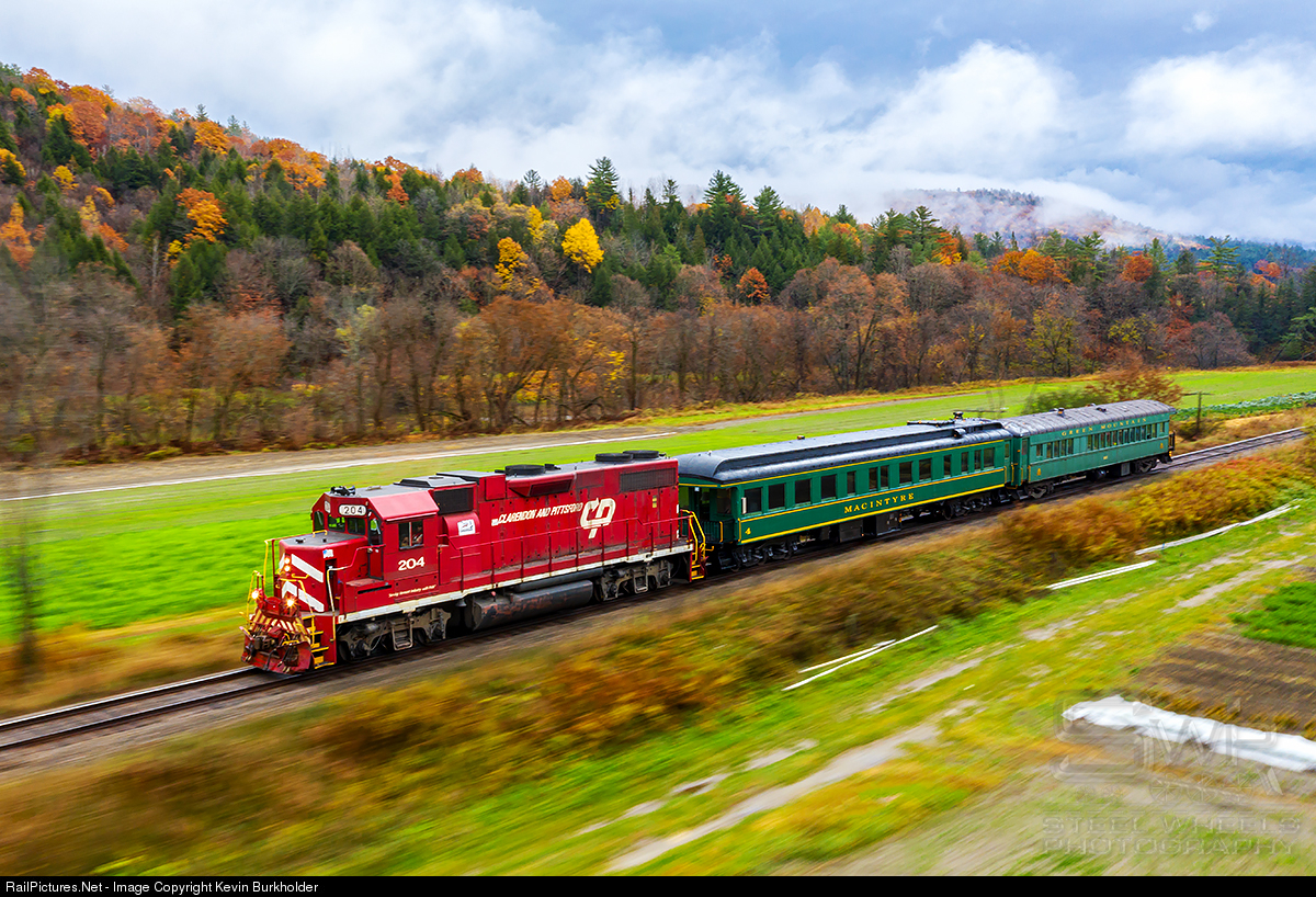 | On October 23, Vermont Rail System hosted the annual Vermont State Inspection of affiliate Washington County Railroad's state-owned trackage on the Lyndonville Subdivision. The train consisted of CLP GP38 204 with the two company business cars, GMRC 1323 and GMRC 4 "MacIntyre" and is seen as paced from the drone rolling through rural Passumpsic, Vermont. Drone matched train speed and shutter speed of 1/15 at f22 and ISO 100. |