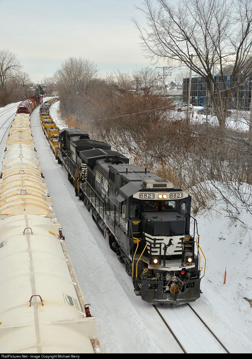 | A transfer for the Port of Montreal with empty well cars heads east through Montreal West with a pair of now retired NS standard cab GE's (NS 8821 & NS 8698). At left is CN X309. NS 8821 was rebuilt into NS 4063, which was wrecked and scrapped in 2018. |