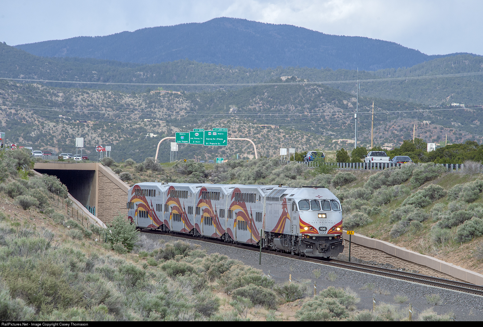 | New Mexico Railrunner's 101 Express passes underneath the southbound lane of Interstate 25 to begins its "median-running" section of the journey southwest towards Albuquerque |