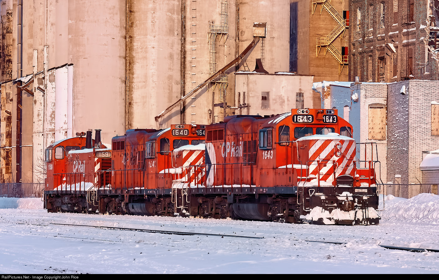 | Now retired, GP9s, CP 1643 and CP 1640 as well as yard control unit CP 1159 between jobs in Thunder Bay, Ontario. |