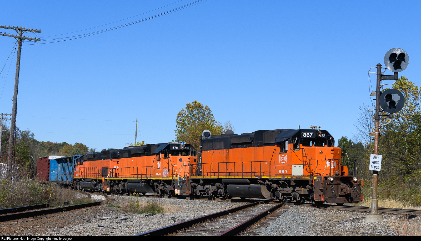 A trio of Bessemer & Lake Erie locos have been reunited on home rails. BLE 867, 878, and 905 are leading the misc run as it departs from Greenville, Pennsylvania and crosses the diamond over the NS Meadville Line.