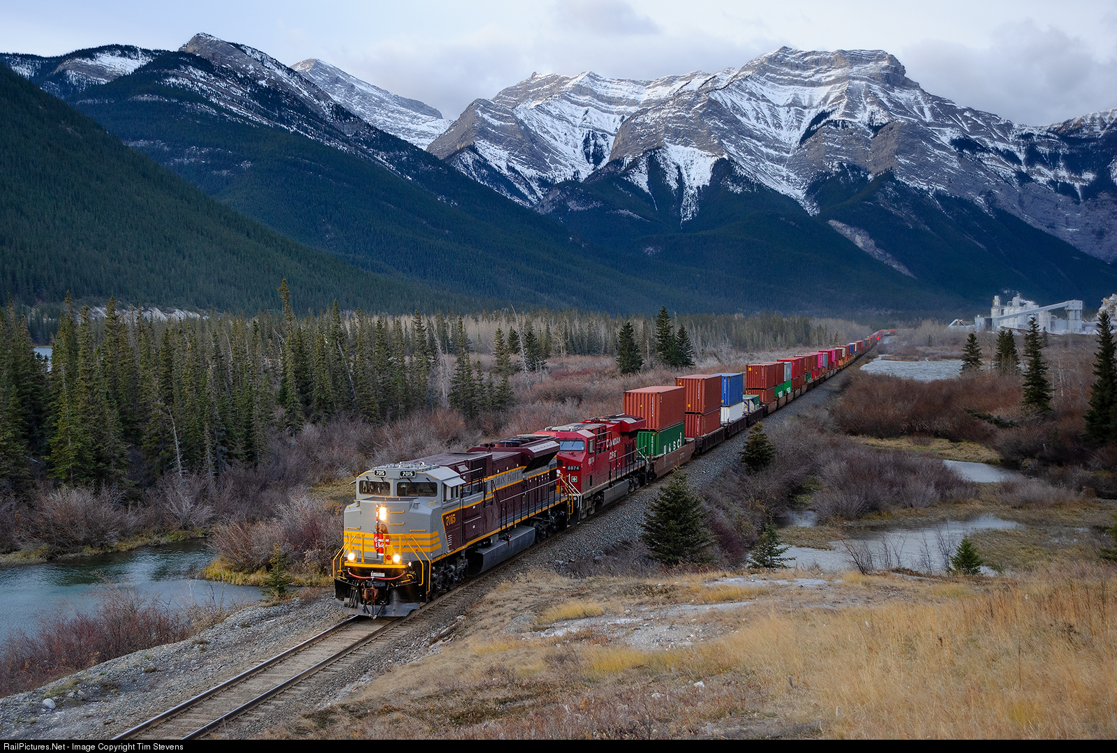 Wearing CP's new "Block" heritage scheme, CP SD70ACU 7015 leads Vancouver IMS-Toronto Yard train 100-24 east on CP's Laggan Sub just east of the siding at Exshaw.