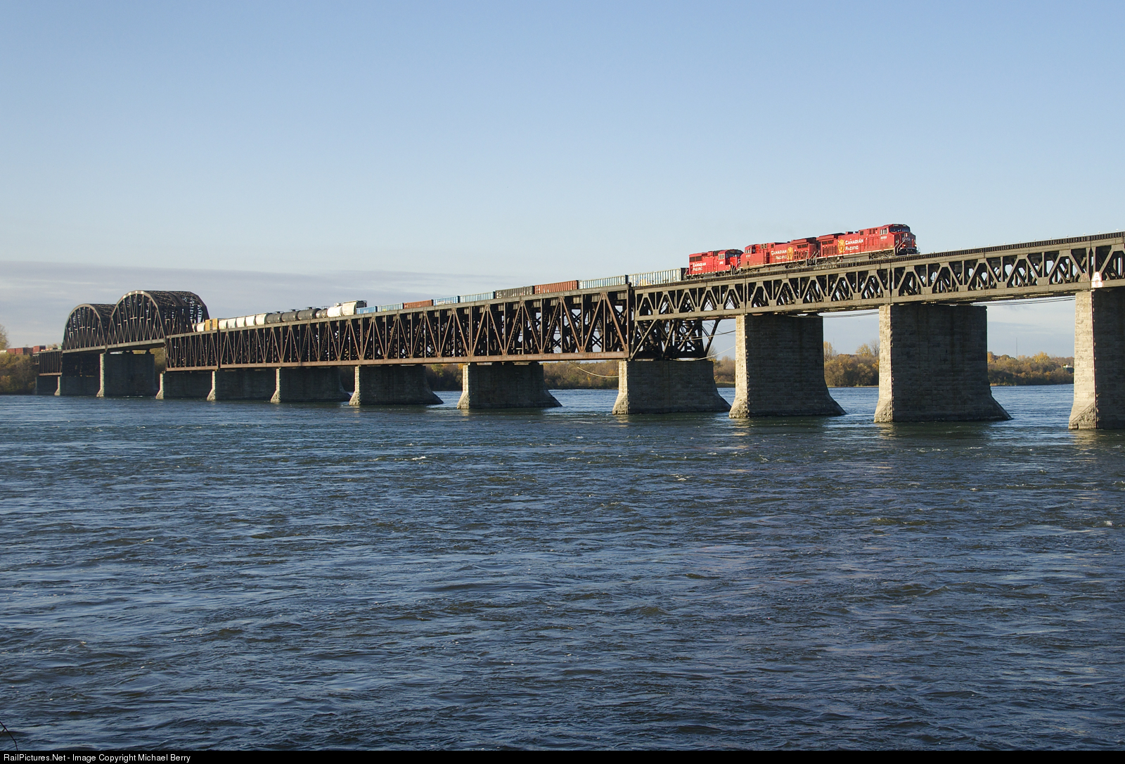 | CP 253 is crossing over the St. Lawrence River on a sunny fall morning. Leading is nearly brand new rebuild CP 8069, with CP 8151 & CP 2252 trailing. CP 2252 is going to the St-Luc shops for servicing after use on D&H local CP D11 during the week. |