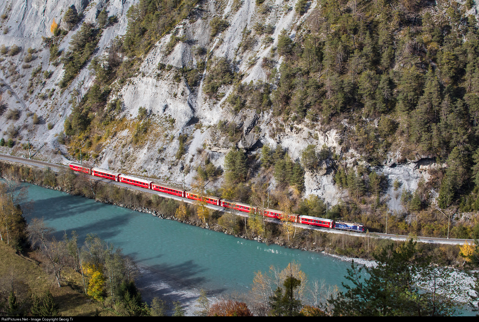 | Ge 4/4 II # 627 "Reichenau-Tamins" in the publicity paint scheme for 100 years line Chur-Arosa is pulling Regio Express 1740 from Disentis to Chur-Landquart (-Scuol-Tarasp) through the gorge of the Ruinaulta along the Vorder Rhine, between Versam-Safien and Trin. |