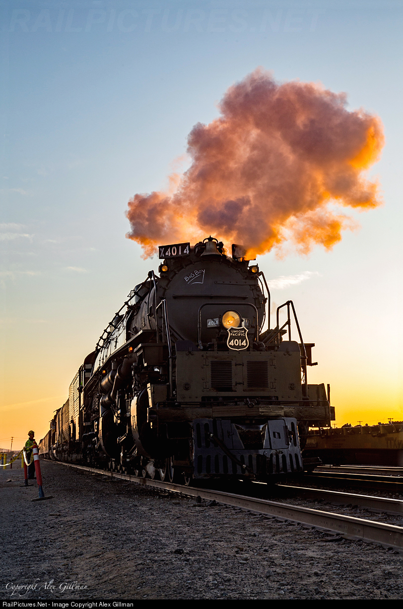 | Breathing Fire. UP 4014, the largest operating steam locomotive in the world, is truly an awe inspiring sight even just building steam pressure in the early morning light. As the sun has just crested the horizon off in the distance, the red/orange light spills onto the exhaust of the massive 4-8-8-4 as the locomotive's air pumps exhale while working to build pressure through the train's brake system. |