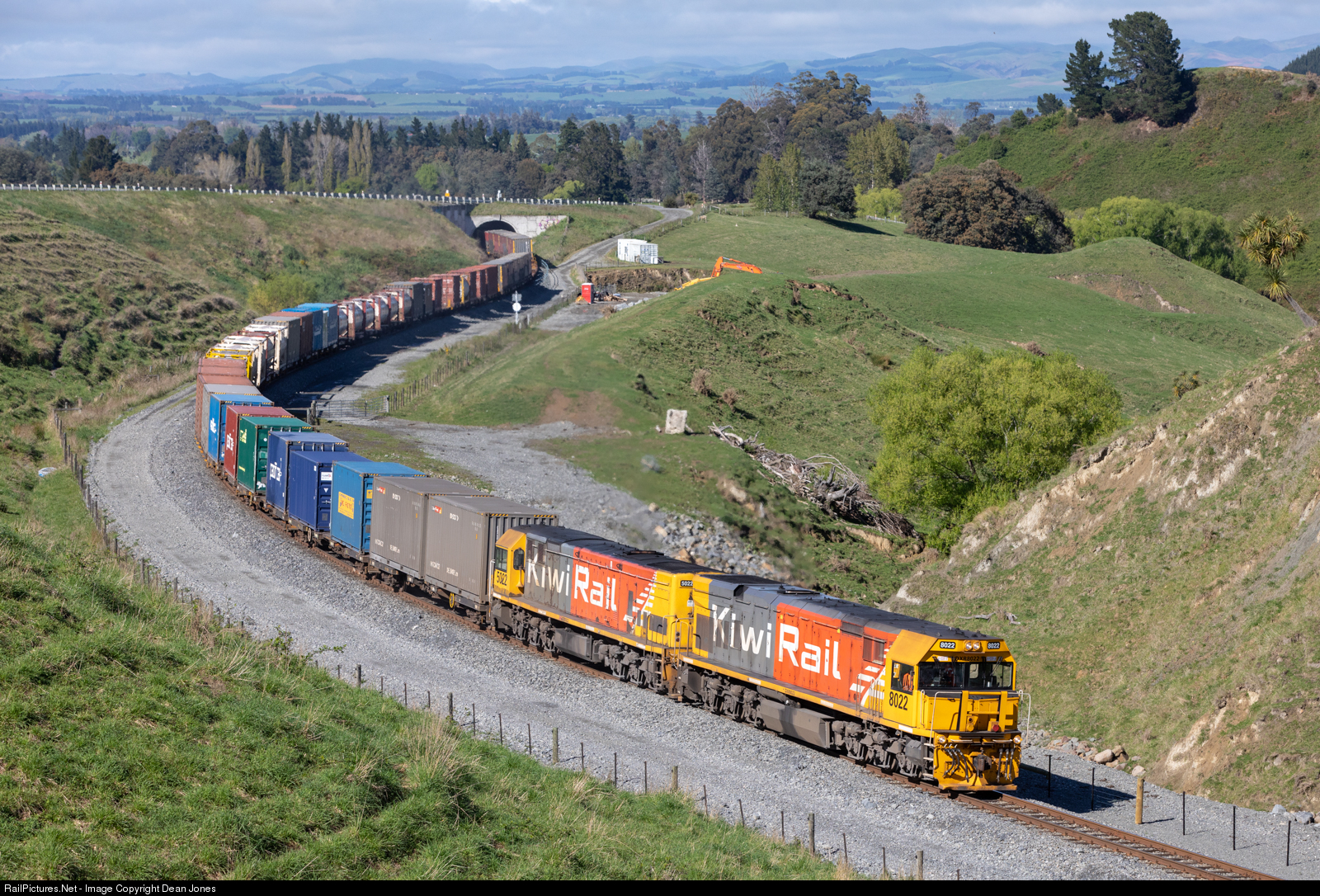 KiwiRail rebuilt DX class, DXR8022 and DXB5022 lead Christchurch to Picton general freight service 736 through the curves at Hawkswood, to the north of Christchurch on New Zealands South Island. This is quite a pleasing train to chase, leaving Christchurch at 0735 daily for the northbound trip through to Picton, where the goods are placed onto a KiwiRail owned Ferry service to the North Island. The DXR is one of 2 rebuilt DX class, whilst the DXB has had Brightstar traction control added to improve tractive effort.