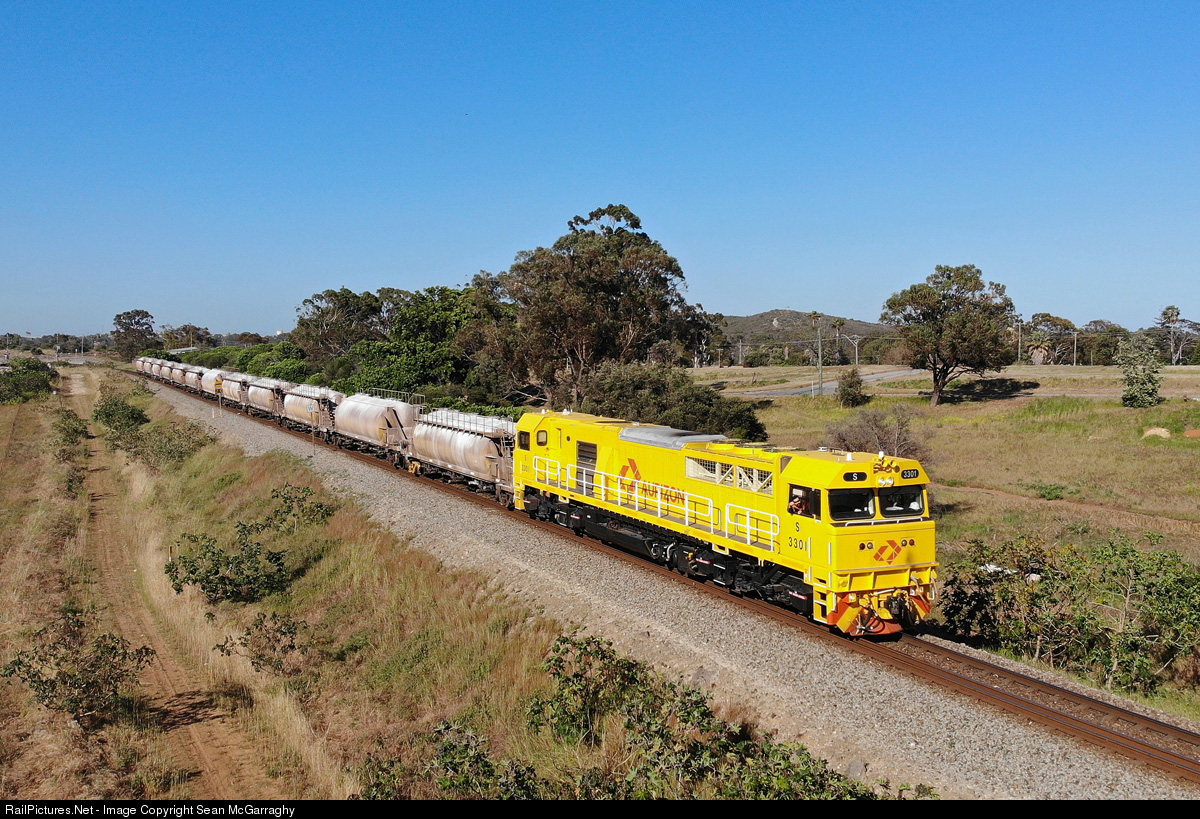 | The empty lime train from Hamilton crawls through a speed restriction at Wattleup nearing Soundcem where this train will load. S3301 is hauling train 7572, a short 12 wagon length train of XP hoppers. |