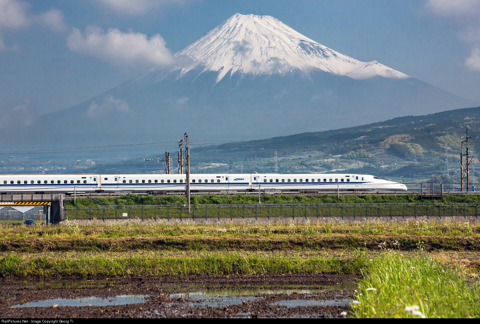 | At 8.24 AM an unknown N700 "Shinkansen" high speed train of JR Central in "Nozomi" service is passing 3776 meter high Fuji volcano in a distance of about 25 kilometers, with 270 km per hour velocity, the highest speed on the Tokaido Shinkansen. The photographer left Tokio in the morning at about 6 AM with a "Kodama" shinkansen, changed to a local train and hiked about half an hour to this point of desire. The Fuji volcano is designated UNESCO World Heritage since july 2013. |