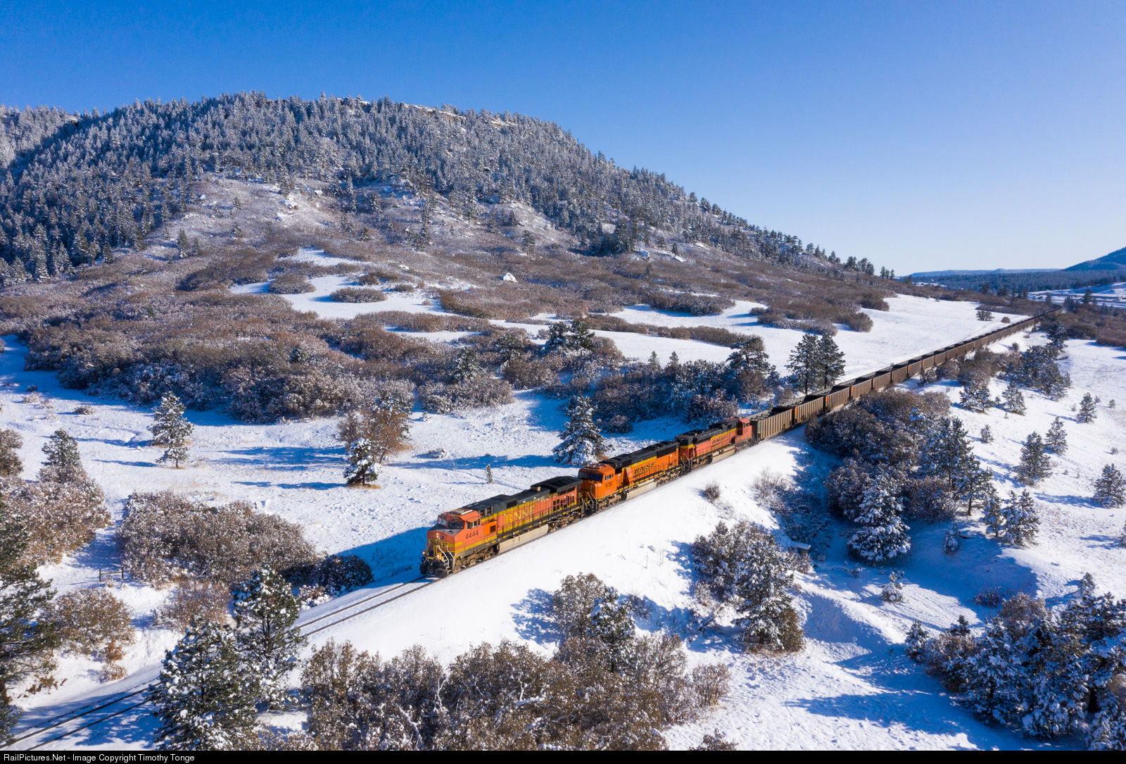 BNSF 4444 leads a northbound coal empty between Larkspur, CO and Castle Rock, CO, on Colorado;s Joint line. The temperature was hovering around 18 degrees during the late afternoon when the train arrived, with 6" or so of new snow on the ground. Oct 30, 2019.