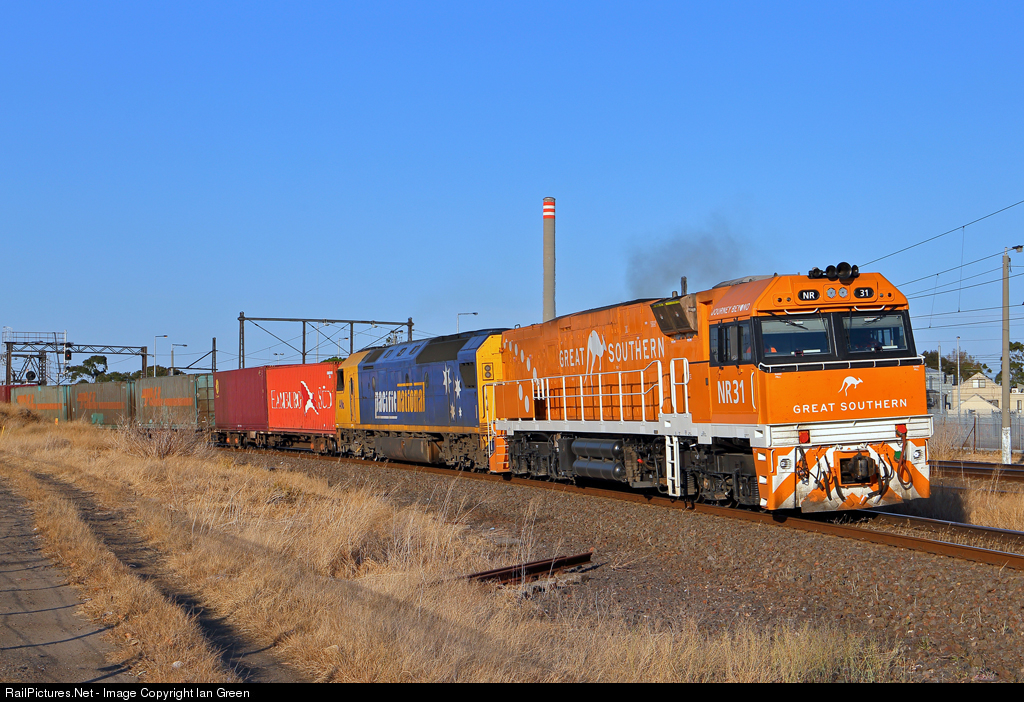 | Wearing a special livery to promote the upcoming Great Southern rail service between Adelaide and Brisbane, NR31 leads AN6 on 5MA5 freight at Newport. |