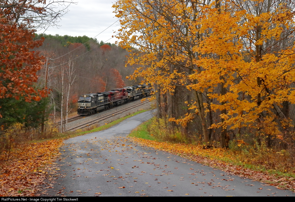 | On the final day of October, a last gasp of Fall foliage along Schoonmaker Road in Duanesburg, New York leads one's eyes to NS Train 30T as it heads south down the former D&H. |
