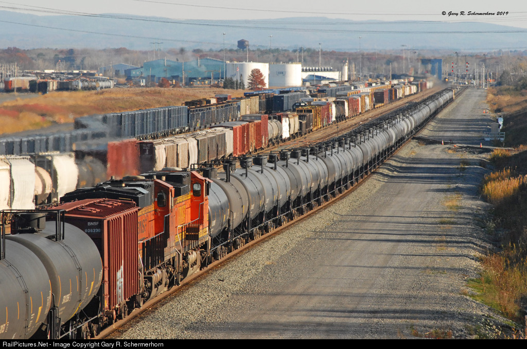 A 190 car monster double tanker enters Selkirk Yard with a double BNSF DPU set mid-train. The train will swap crews at CP-14 and continue south on the River Sun as a double train set. The monster loaded oil likely consolidated to run to Selkirk due to backed up traffic from Friday’s washout at Utica and lack of available rested crews.