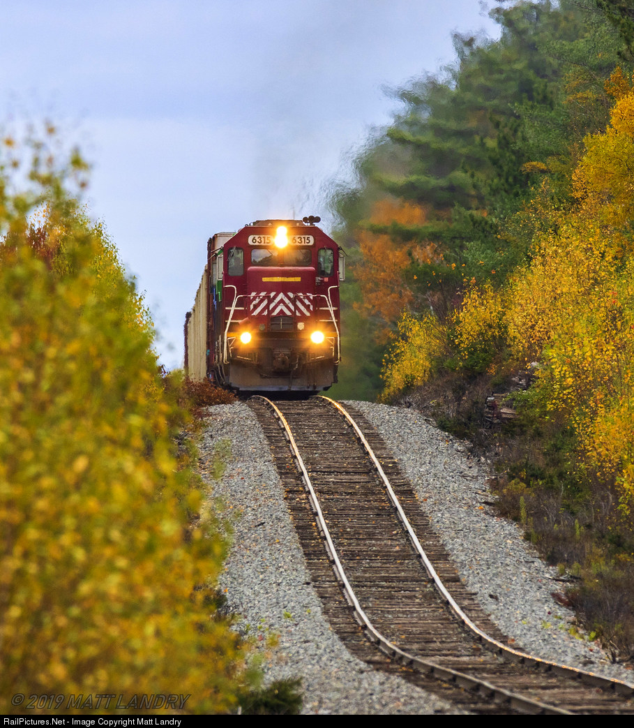 | NBSR 6315 leads train 907, as they will begin the descent down the dip at Cork, New Brunswick. |