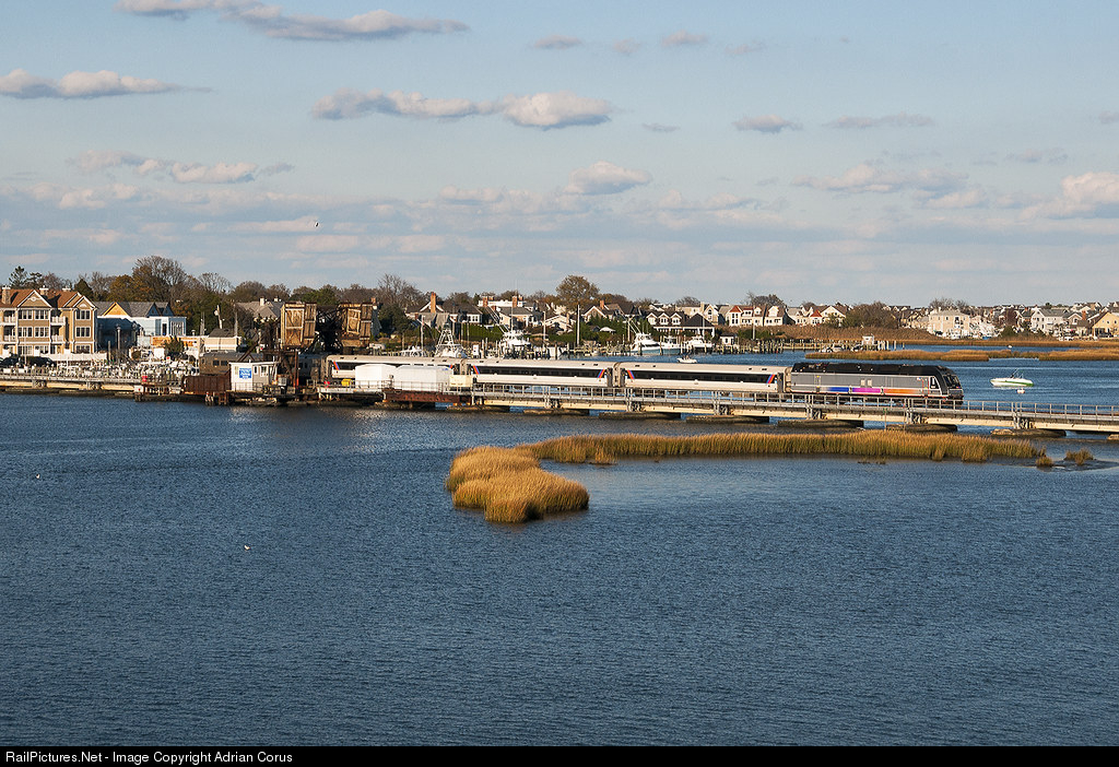 | With the sun setting earlier now that the clocks have been set the sun is just right this time of year for this shot. Beginning its final descent the sun casts its golden light over the Manasquan River as an eastbound Bay Head to Long Branch shuttle crosses NJ Transit's Brielle Drawbridge on the North Jersey Coast Line. The ALP-45DP locomotive would be replaced later that night by a PL42AC and a Comet IIM was added making it a typical 5-car shuttle. |
