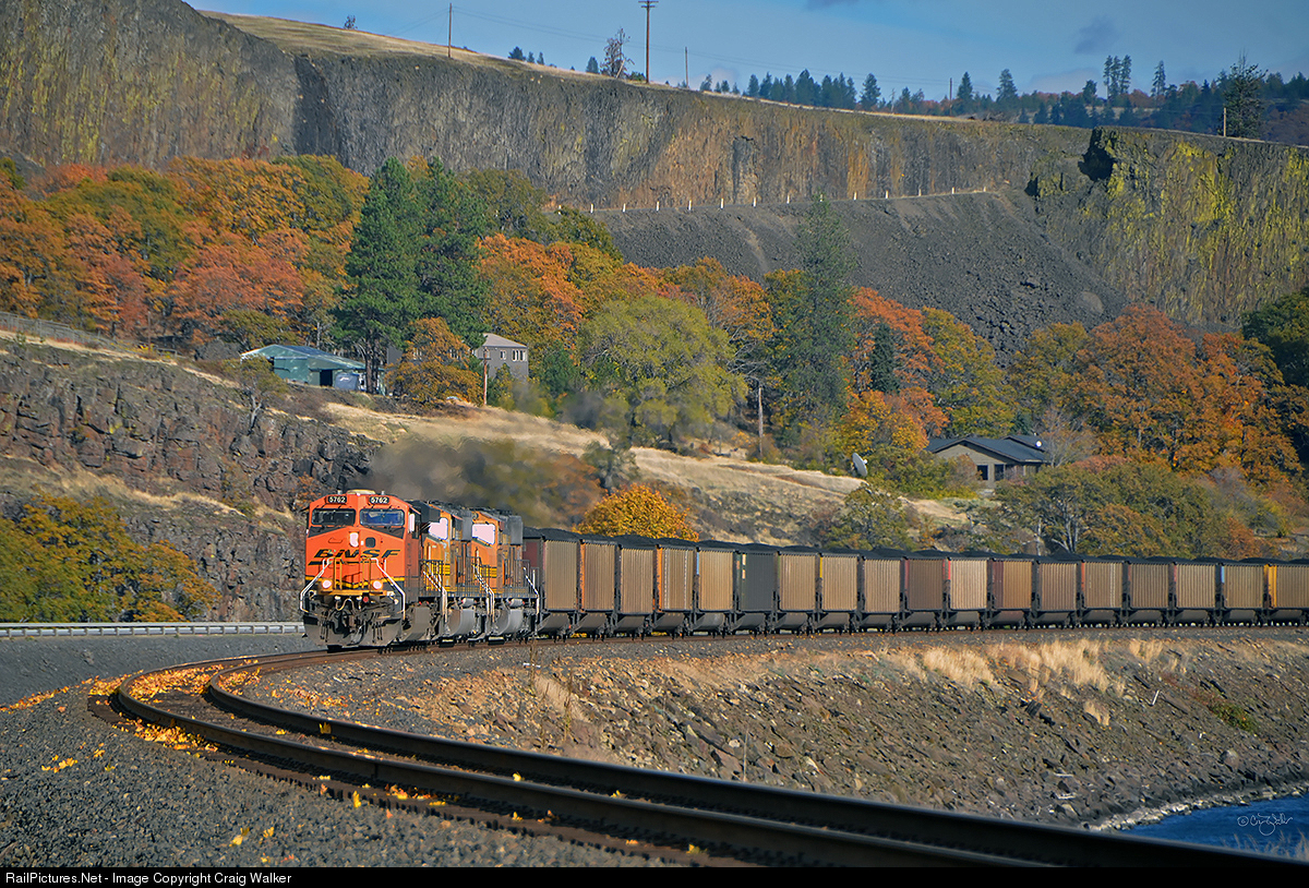 BNSF Railway train C-SXMRBG3-53 rounds the big curve in White Salmon, Washington. This is BNSF’s scenic Fallbridge Sub, the former Spokane Portland & Seattle mainline that follows the Columbia River’s northern shore. BNSF ES44AC 5762, SD70MAC 8803 and SD70MC 9899 (with ES44AC 6166 as the rear DPU) are pulling a loaded coal train from Signal Peak, Montana, to Robert Banks (Global) in British Columbia. (October 25, 2019)
