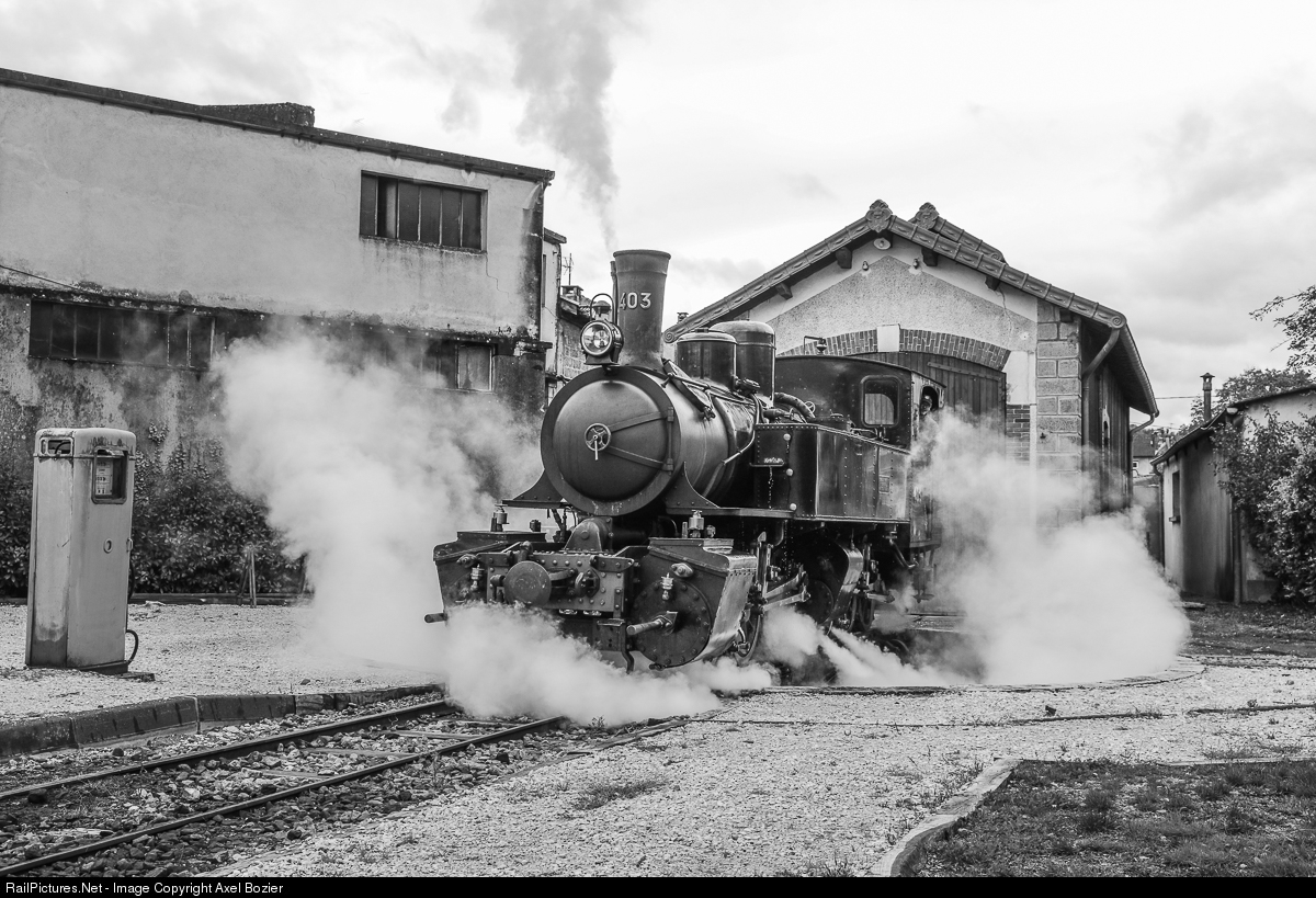 | Mallet steam locomotive #403, built in 1903 by SLM Winterthur (Swiss Locomotive and Machine Works) for the French "Compagnie des chemins de fer départementaux" is seen on the turntable at Lamastre. Lamastre is the final station of the meter gauge tourist railroad "Chemin de fer du Vivarais", the original line ran a further 19 km (12 miles) to Le Cheylard before it closed in 1968. |