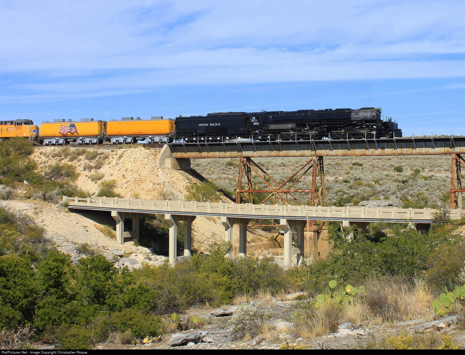 Union Pacific Railroad's 4014 "Big Boy" leads the Great Race Across the Southwest Special Passenger Train. The train rolls slowly across the bridge a mile and a half east of Langtry, Texas on November 3, 2019, the same bridge in the movie, Lone Star with Kris Kristofferson and Chris Cooper.