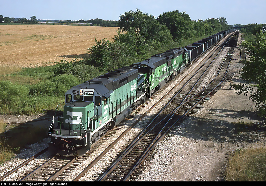 | Burlington Northern SD40-2 7833, C30-7 5026 and SD40-2 8029 near Nevada, Missouri. |