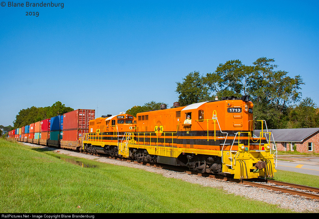 | Georgia Central L782 heads east through the small town of Lyons, Georgia with a small train of double stacks for the port in Ellabell. Leading the train on this day was Georgia Central 1713 which was the Detroit Toledo Shore Line bicentennial unit number 76 |