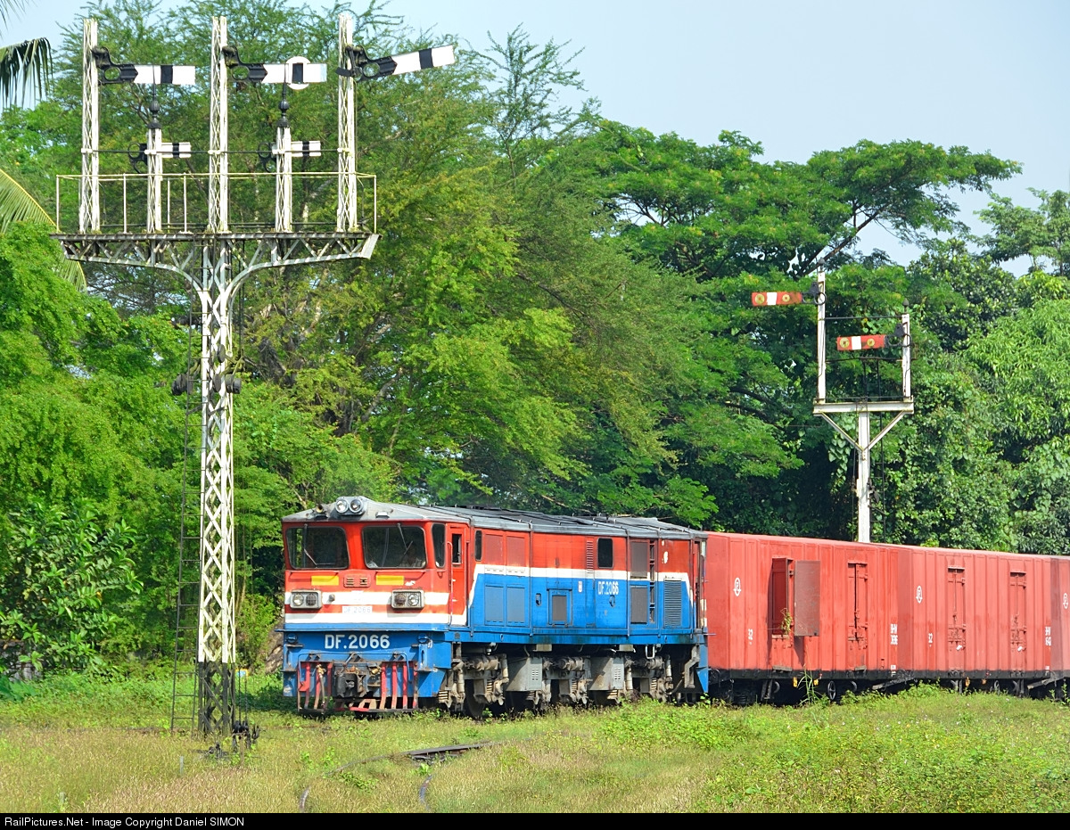 | A freight train is arriving at Bago hauled by the DF 2066 and is passing under the imposing semaphores located at the station entrance. The Type CKD metre-gauge diesel locomotives have been shipped to Myanmar from the CRRC Dalian Locomotive & Rolling Stock plant in China. The 100 km/h locomotives have three two-axle bogies. According to the manufacturer they are designed to haul main line freight services in Southeast Asian conditions, including high temperatures, a restricted loading gauge, steep gradients, poor track conditions and curves down to 62 m radius. |