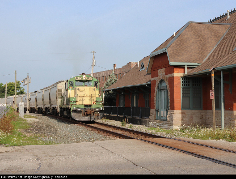| CEIW 4295, a CNW GP7 rebuild, leads a small local past the former Big Four depot in Anderson, Indiana. |