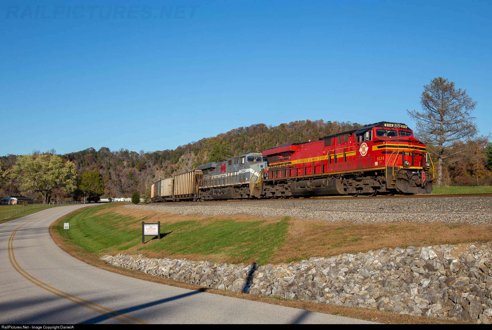 | Double Heritage! The original NS heritage unit and the Monongahela heritage unit serve as rear DPU's on the end of NS Q62 (extra 762) as they pass through Wabun, Va on the Whitethorne District. |