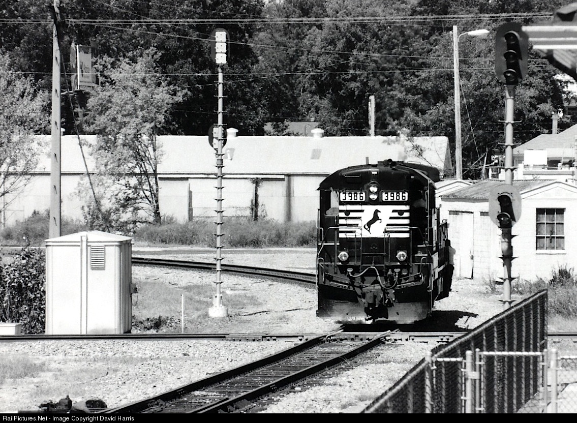 The Pine Belt Southern's Opelika-Lafayette operation of a former NS (Southern/C of G) line lasted from 1996 until 2003. The Lafayette end was pretty simple - work the woodyards then head for Opelika. In Opelika, things were much more complicated, as the necessary switching took the PB crew onto the NS main, which required ok from NS, and also across the CSX/NS crossing, which required CSX ok. CSX ok was also needed for operation over a two-mile segment via CSX between downtown and a spot called Roanoke Junction. All that meant a lot of waiting for the big roads to respond, and really got tricky on those days when PB's train was too long to fit on the connector between CSX and NS. This image shows the two-man crew moving west on NS and across CSX.