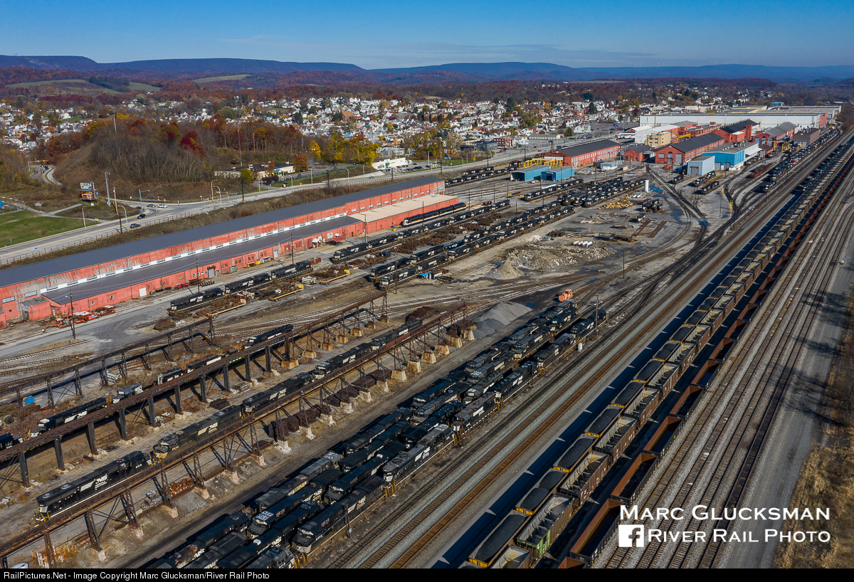 Loads for pickup. The Altoona, Pennsylvania Juniata Locomotive Shops and adjoining yard of Norfolk Southern were loaded with engines of all kinds on Saturday, November 2, 2019. Of note are the A-B-B-A F units which were recently listed for sale. There are also a variety of other EMDs, some of which have moved out already, including SD60s, 70s, and 80s of various classification as the railroad continues to lower its engine to count to meet its projected needs.