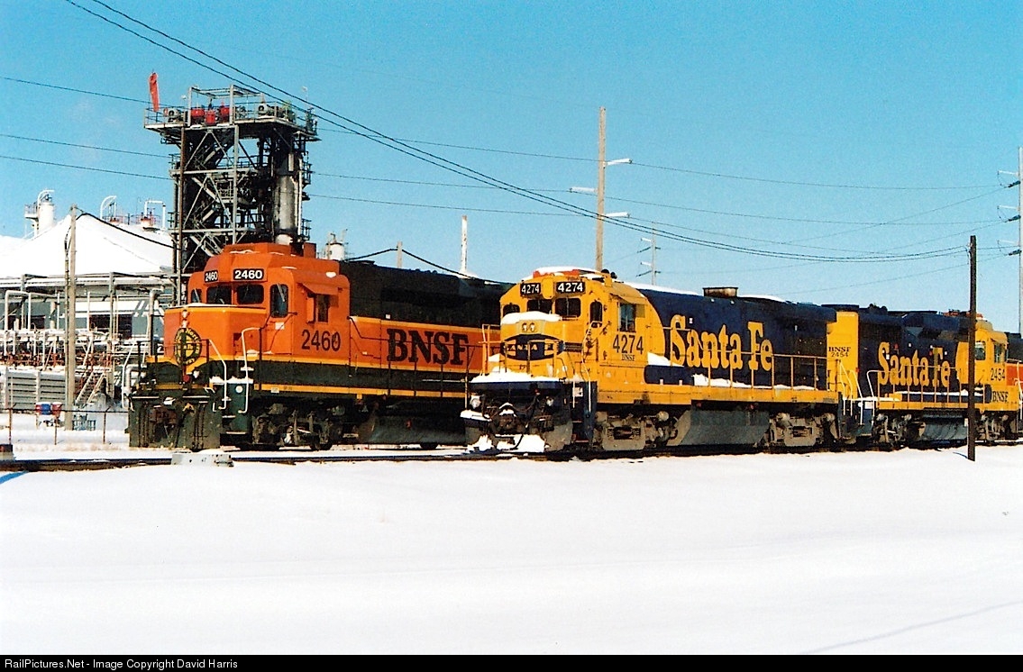 | B-B local power waits in the snow for the next call to service. B23-7 4274 was delivered to Santa Fe in December 1985, but I bet it left BNSF's roster before GP30u 2460, an upgraded version of a GP30 delivered to Santa Fe from EMD in March 1963. |