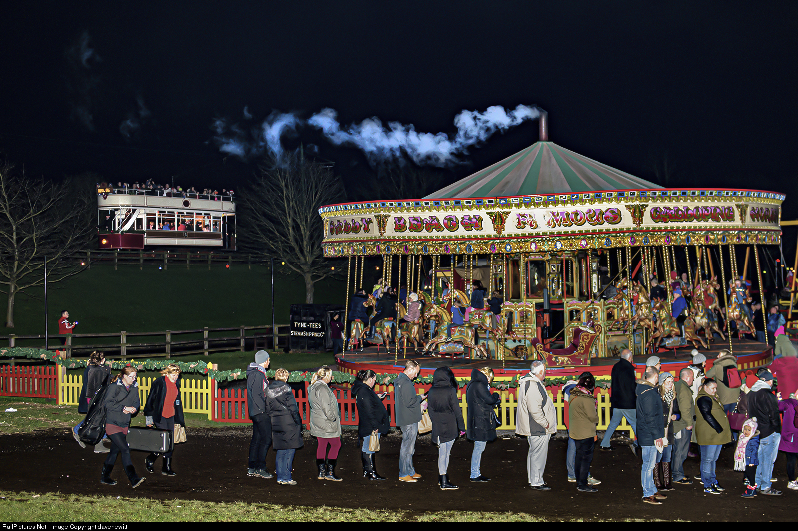 Every year Beamish museum opens its doors for three Fridays before Christmas for visitors to experience a 1913 Christmas. These are the ony times when it is possible to photograph the trams and trains at night time. Here a queue has formed to ride the steam driven carousel whilst on the tramway a tram brins more people to the town