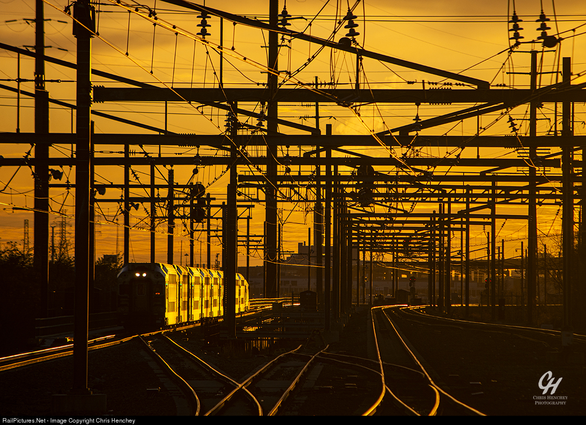 In sea of rails, wires, and signals, an inbound New Jersey Transit Morris & Essex service to New York slows for its station stop at Secaucus Junction. A glorious November sunset lights up the sky, providing a surreal scene that makes even suburban North Jersey look spectacular.
