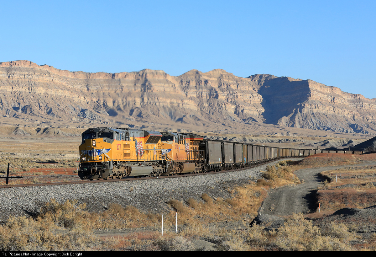 UP 3071, an SD70ACe-T4 model, leads this export coal train, which was loaded on the North Fork branch south of Grand Junction, Colorado. This ex. D&RGW trackage parallels the majestic Book Cliffs from Palisade, Colorado to Helper, Utah. At over 200 miles It is the longest continuous escarpment in the world. Photo taken at east switch Grassy siding.