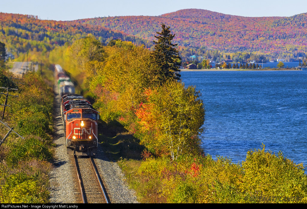 An SD75i, CN 5665, is in charge of eastbound train 306, rumbling by the scenic Lac Baker, New Brunswick, about 10 minutes east of the Quebec/New Brunswick border. This area of New Brunswick is great to shoot at almost year round, but Fall is when it's the nicest.