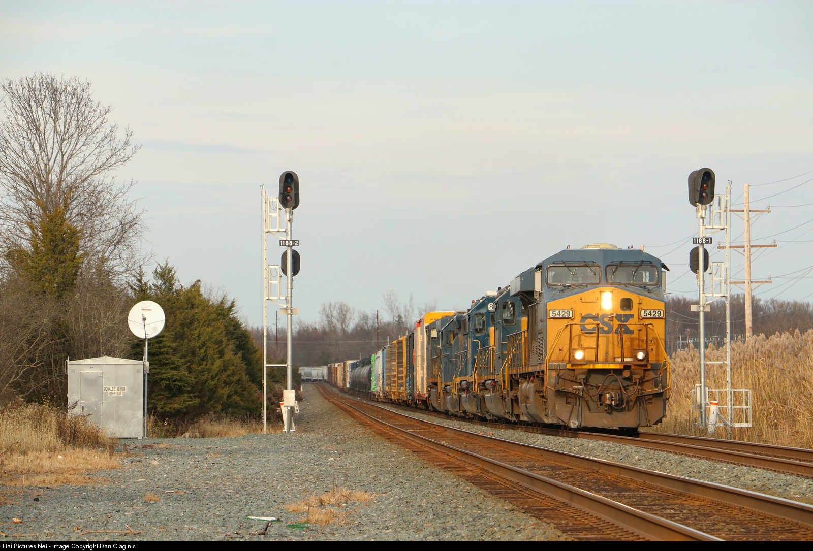 An EMD sandwich; CSX manifest train Q40310 (Selkirk, NY to Philadelphia, PA) is seen accelerating through the QR-118.8 signals at Flint Mine RD in Coxsackie, NY. Consisting of two generic CSX GEVOs sandwiching a trio of CSX EMD variants, this train made for another train in a long list of trains with the wrong locomotive leading on the day.