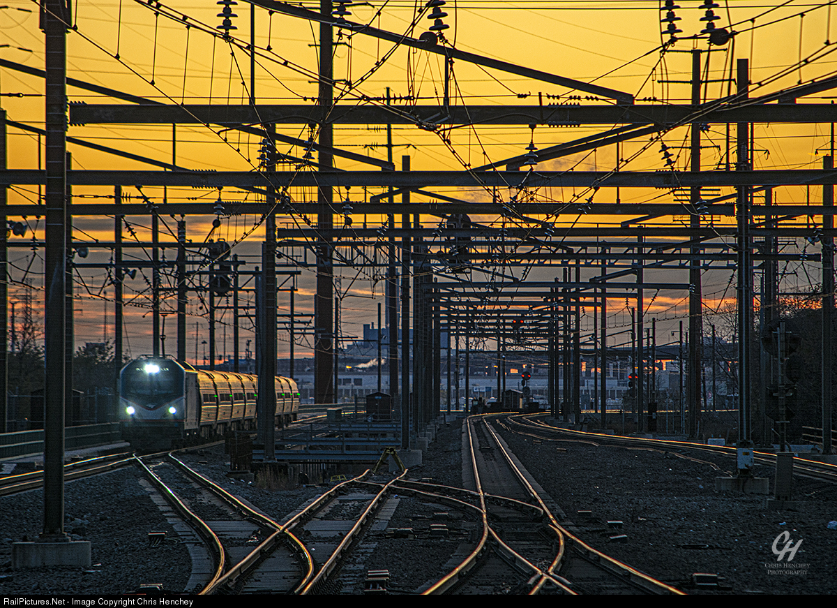 A northbound Amtrak Regional approaches Secaucus Junction station on the last couple of miles on the mainland in New Jersey before the Hudson River Tunnels. The evening sunset provides a striking backdrop for the scene, which will surely be gone once the train comes back above ground east of New York Penn Station.