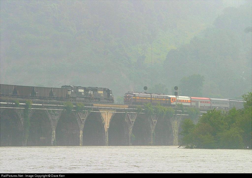 In light fog, westbound 861 led by Bennett Levin's restored E8s meet easbound coal train 801 at Rockville Bridge. Moments later, 801 blocked the view of 861. Canon 10D and 70-200mm lens.