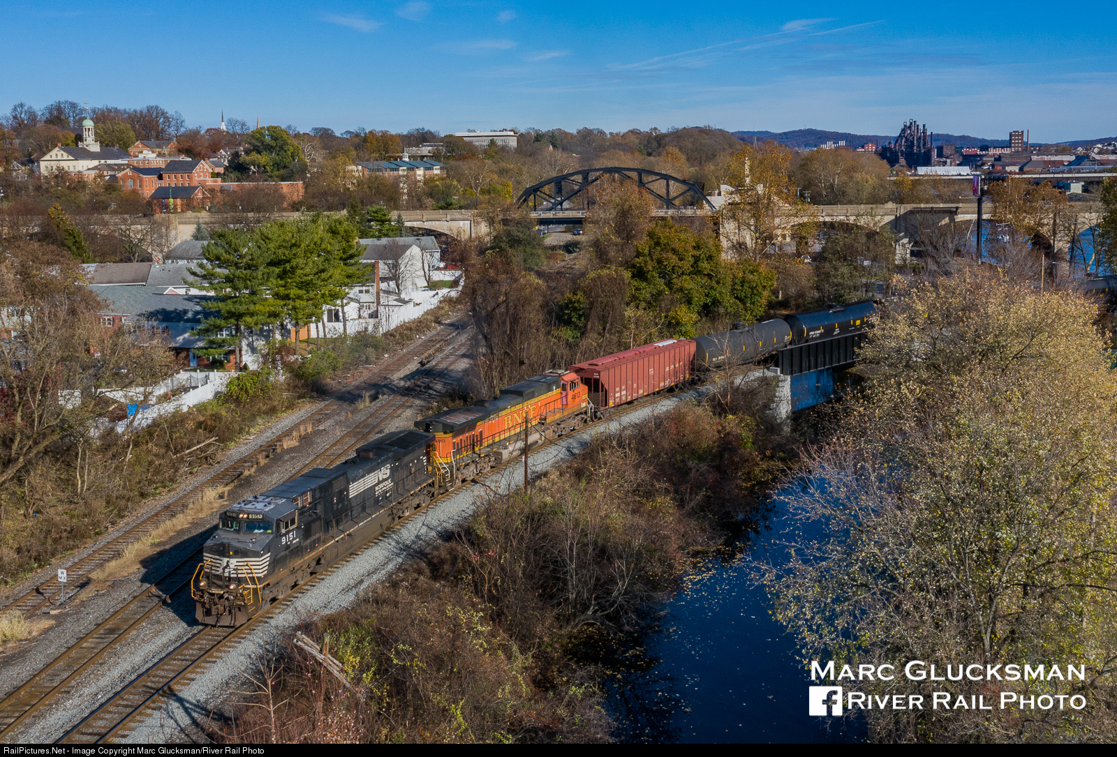 Making a Bee Line across Bethlehem. On Saturday, November 9, 2019, Norfolk Southern Corp Train 67Z NS 9151 and BNSF Railway 4613 made its way across the Lehigh River on the route of the former Reading Railroad. Bethlehem is a city full of landmarks, and in the background the SteelStacks, the Hill To Hill Bridge, and the museums on the north bank are all visible.