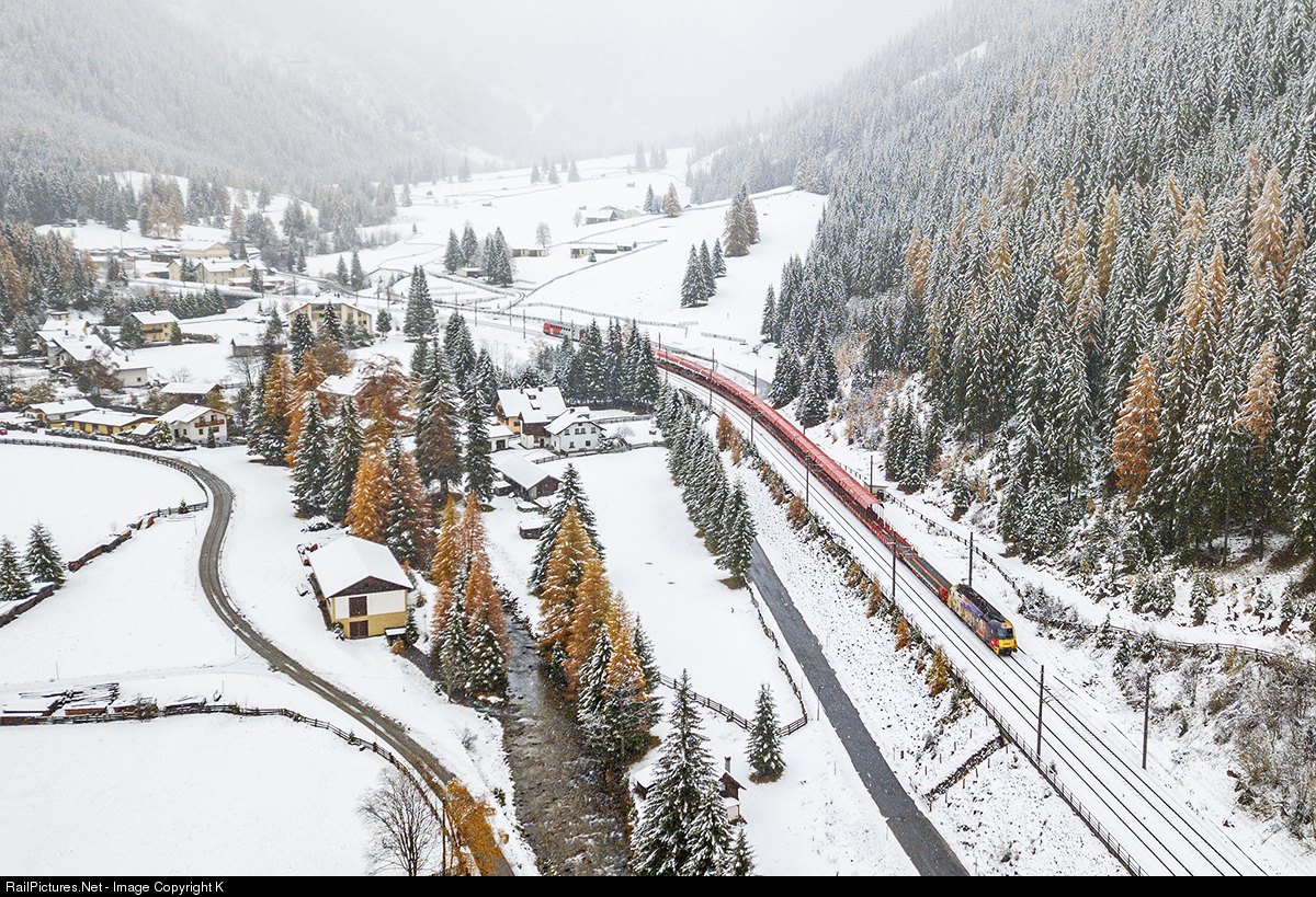 Early snow covering up the still yellow landscape as the ÖAMTC Taurus pushes a car transport train towards Böckstein. It's a lucky occasion to shoot the Austrian Automobile Club's werbelok working on the Autochleuse (ÖBB's car transport service).