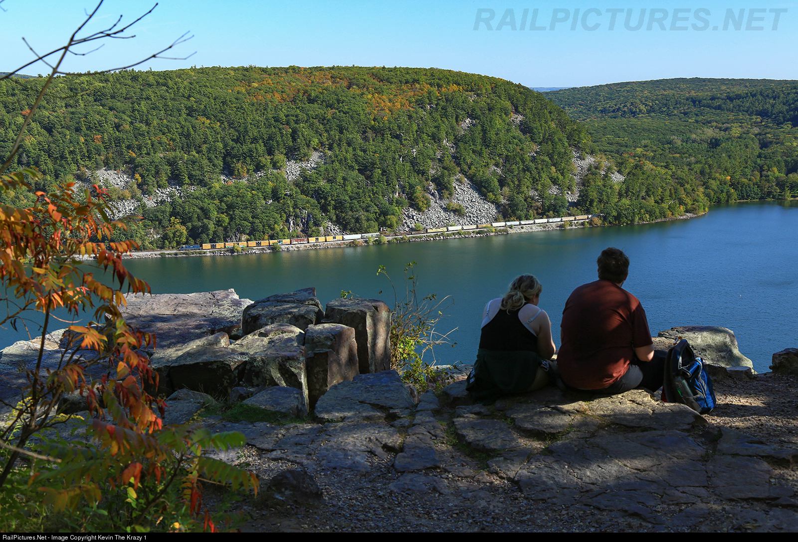A young couple enjoy a sandwich as the northbound Reedsburg job passes through Devils Lake State Park in the mid-afternoon seen from the West Bluff Trail.