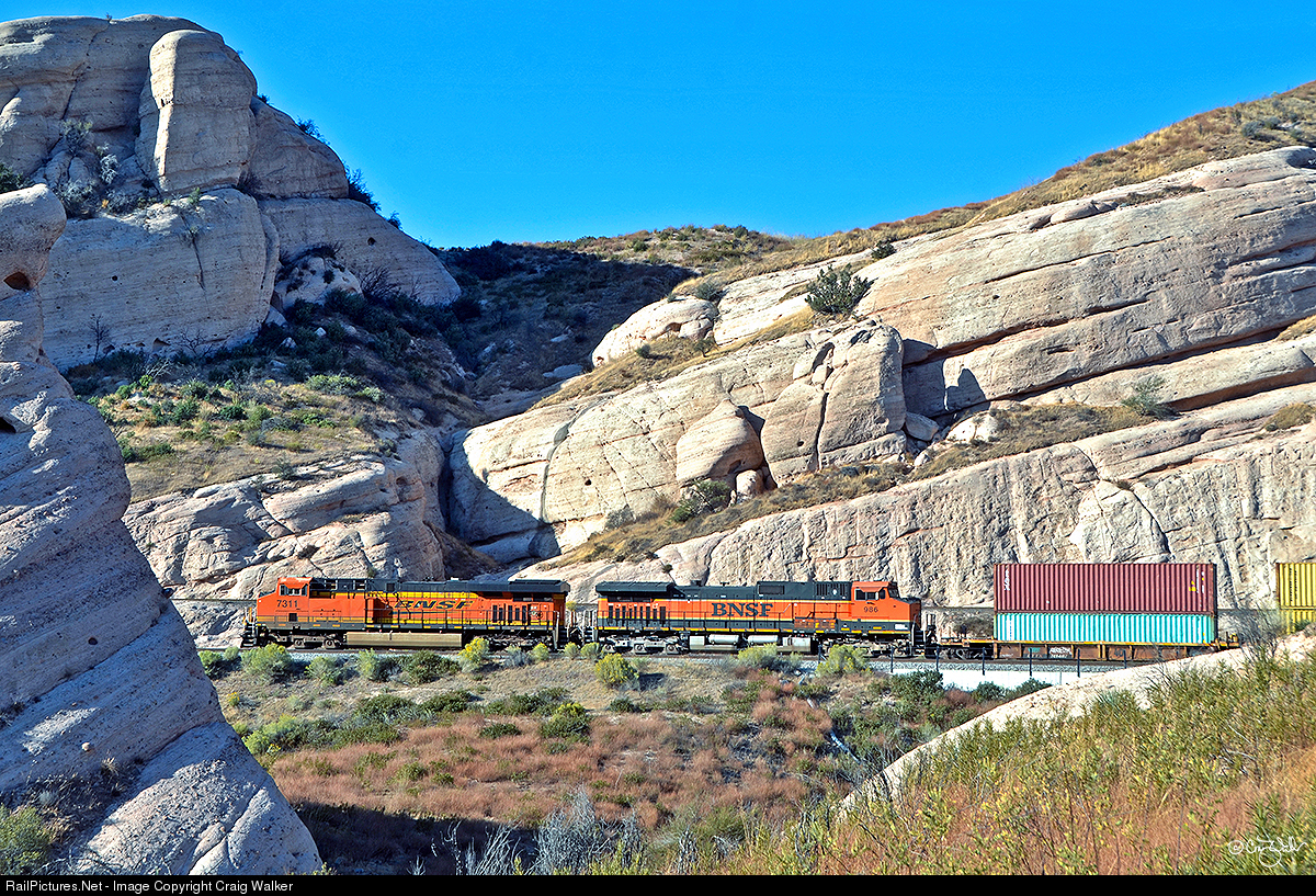 Climbing Cajon Pass, and rounding Sullivan’s Curve in the process, is BNSF Railway train S-LHALPC1-11. On the headend of this intermodal train are BNSF Dash 9-44CWs 4056 and 4592, with the rear Distributed Power Units (DPU) being Dash 9-44CW 986 and ES44DC 7311. (October 12, 2019)