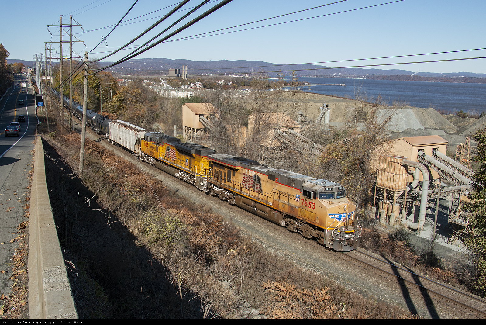 | CSX K648 with a pair of lightly snow-dusted Union Pacific units is well into its run of Haverstraw Hill on the River Sub at Auto 31. The town and much of the Hudson River Valley can be seen in the background behind one of Tilcon New York's many quarrys in the area. |