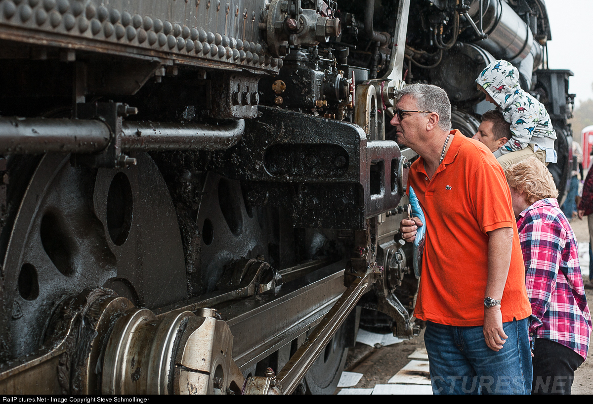 | Visitors admire the massive drivers, rods, and other appliances that make the UP 4014 operate. It's been so long since a large steam locomotive like this has been across so many states that folks don't know what they're looking at. |