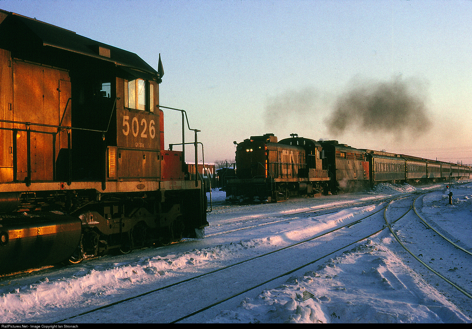 The sun has just risen as the morning commuter train from St. Hyacinthe to Montreal meets an eastbound manifest. The vintage pair of MLW's consisting of RS-3 3900 and FPA-2 6750 were assigned to the all heavyweight consist for a number of years.