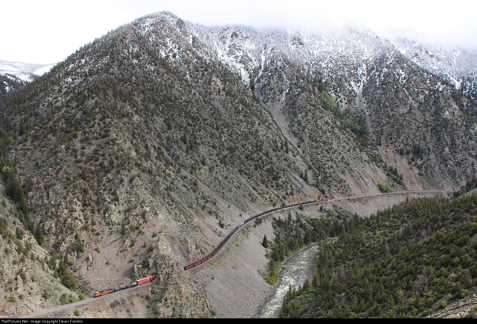 BNSF's Provo-Denver manifest snakes through the steep and rugged Gore Canyon on the upper Colorado River as the morning's snow storm recedes. Though the canyon is short (approx. 3 miles), its walls ascend close to 1000' on either side and the engineering required by the railway to navigate it was quite the feat for the time.