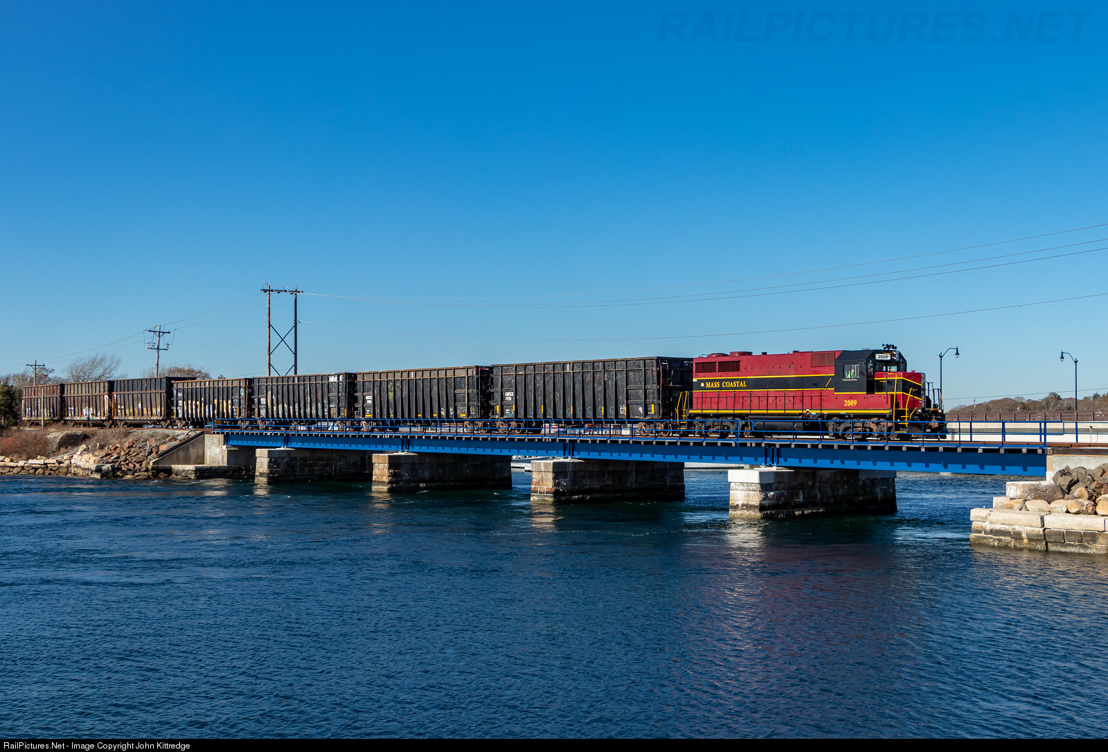 | Mass Coastal's former Illinois Central GP28 2009 leads a cut of empty Construction Debris hoppers across the Cohasset Narrows bridge near Buzzards Bay on their way to Otis ANGB to pick up loads. The 2009 was one of only 31 GP28s constructed by EMD in 1964. |