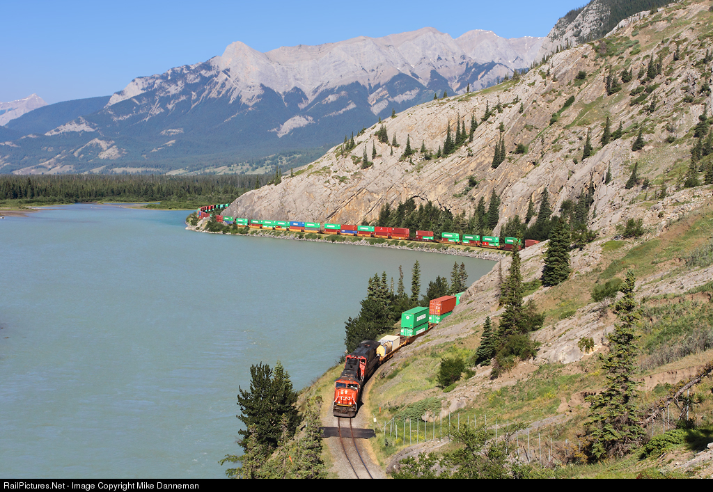 Canadian National train No. 112 snakes along the shore of the Athabasca River and soon will exit Jasper National Park east of Park Gate, Alberta, on July 12, 2014. The train is approaching Brule Tunnel, with the actual border of the park running right over the top.
