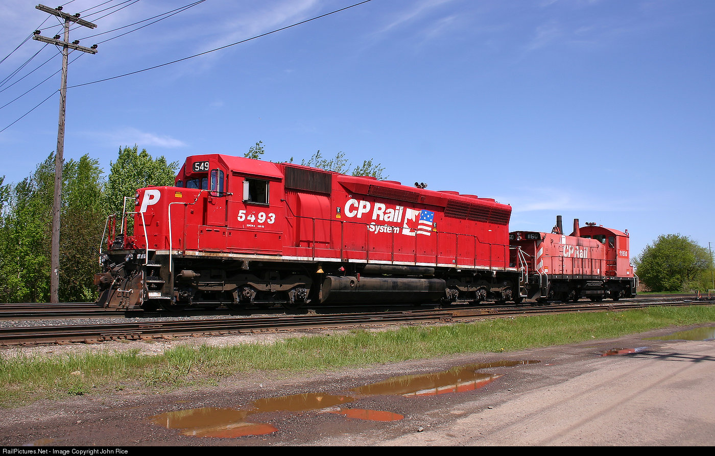 | Built as an SD45 in 1968, CP 5493 was rebuilt by Morrison Knudson to SD40M-2, and purchased by CP in 1995. For several years it did yard duty in Thunder Bay, Ontario and was finally retired in 2011 after 43 years of service. Shown here with yard Control Unit 1160. |