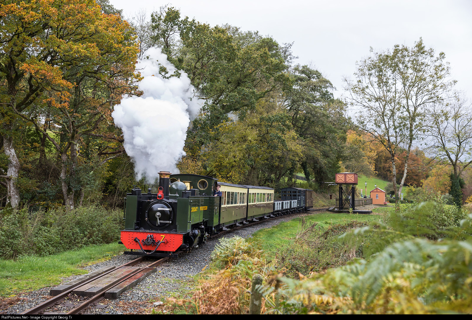 2-6-2 T steamlocomotive # 7 of the Vale of Rheidol railway, in the Great Western livery, is leaving the water stop of Nantyronen with a photo charter. # 7 was built in 1923 at Great Western Railway’s Swindon works alongside sister locomotive # 8. After four years of hard work by a dedicated team of engineers, the iconic locomotive # 7 returned to steam in October 2018. The four year project costing £370,000 has not only restored the locomotive, but also re-introduced engineering excellence within Aberystwyth for the first time in many years.