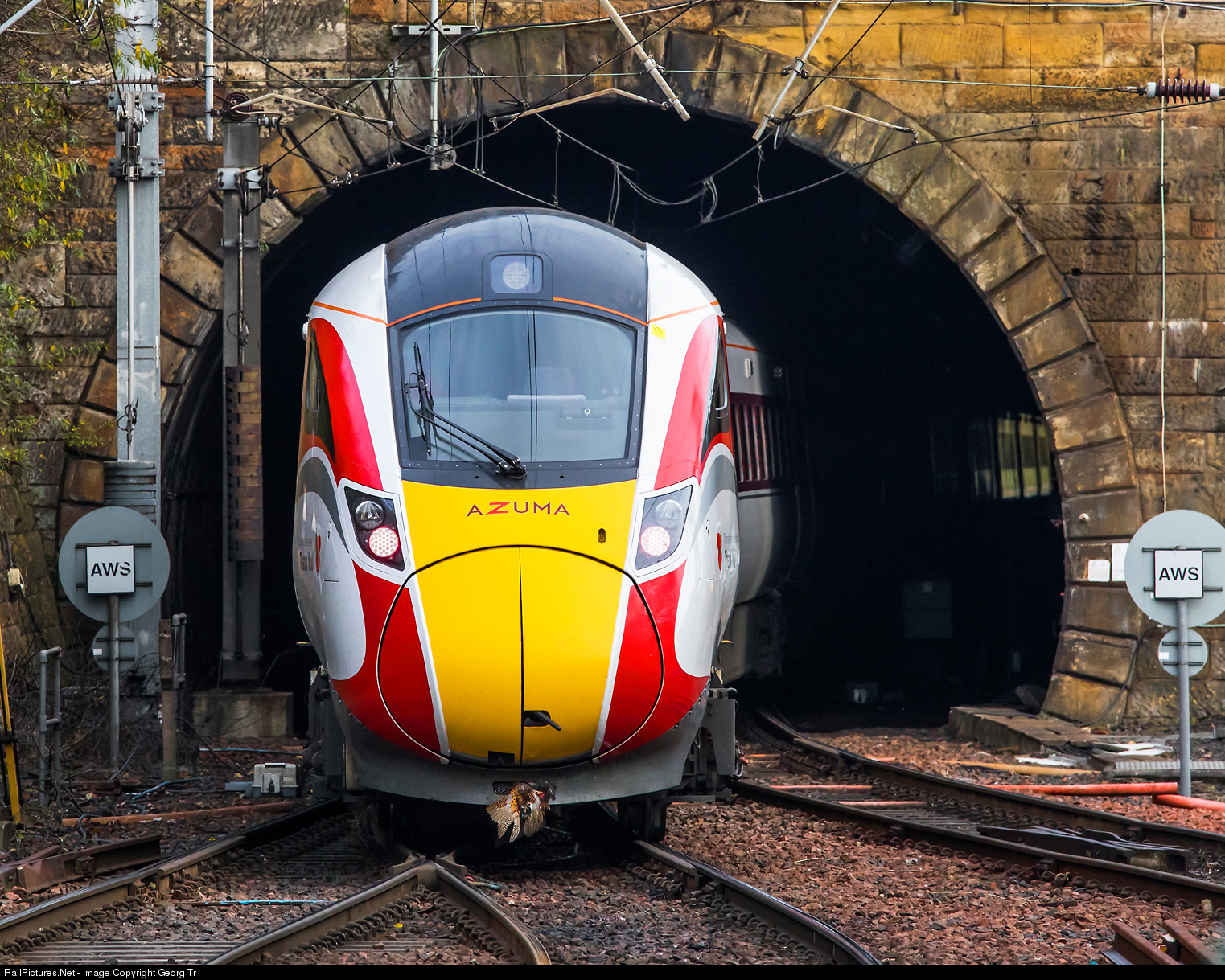 | "Azuma" highspeed train 800 # 111 of the LNER (London North Eastern Railway) is leaving Edinburgh Waverley station as train 1E14 to London Kings Cross, entering the Calton north tunnel. Note the bird of prey, which lost its life at the cowcatcher of this 140 miles per hour train. The class 800 trains are built by Hitachi in the Newton Aycliffe works near Darlington. |