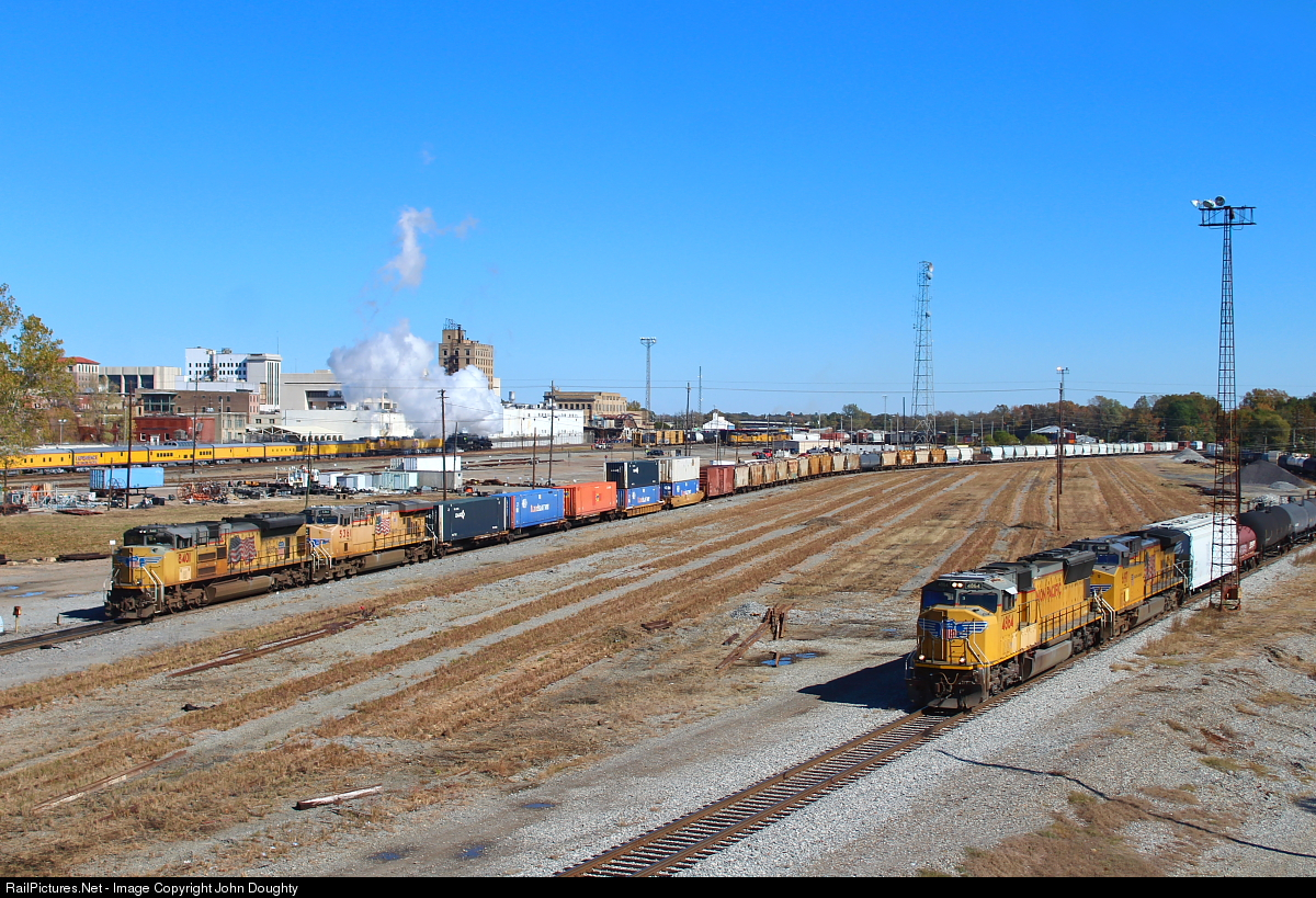 Union Pacific 4014 enters the Texarkana yard and is about to stop at the Amtrak Depot. The dispatcher can now get two westbound freight on the move out of the yard that have been waiting patiently for the arrival of the Big Boy special.